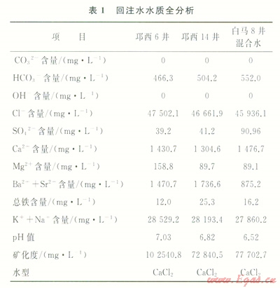 白馬8井是四川盆地邛西氣田回注系統(tǒng)中重要的回注井之一,該回注井接收來(lái)自邛西氣田邛西6井、邛西14井、大4井等6口氣井采出的氣田水混合注入地層,日回注量超過(guò)450m3。在該氣田水回注系統(tǒng)中,管線結(jié)垢導(dǎo)致通徑變小、水流阻力增大,注水壓力升高,不僅嚴(yán)重影響了回注效率且注水泵高負(fù)荷運(yùn)轉(zhuǎn)存在較大的安全隱患。為解決氣田水回注系統(tǒng)管線結(jié)垢給邛西氣田氣井正常生產(chǎn)帶來(lái)的影響,對(duì)邛西氣田白馬8井回注站回注系統(tǒng)水質(zhì)及垢樣進(jìn)行了調(diào)查、分析,找出了造成管線結(jié)垢主要原因并進(jìn)行了阻垢劑篩選及現(xiàn)場(chǎng)試驗(yàn)。