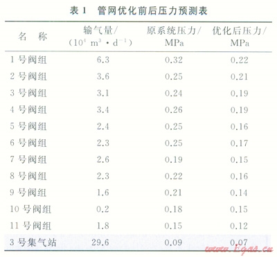 由以上計算可知,在2號閥組經(jīng)3號閥組、4號閥組、節(jié)點l、節(jié)點2、9號閥組至ll號閥組新建一條采氣干線作為復(fù)線,該復(fù)線建設(shè)后,管網(wǎng)起點1號閥組壓力進行對比,壓力將從0.32MPa降低至0.22MPa,終端3號站進站壓力可從0.09MPa降至0.07MPa,系統(tǒng)運行壓力不均衡狀況得到大大的緩解。