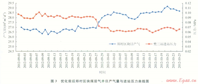 優(yōu)化調(diào)整后鄭村區(qū)塊煤層氣井日產(chǎn)氣量明顯上升,平均日增產(chǎn)氣量2.5×101 m”,集氣站進站壓力明顯下降,由0.09MPa降至0.06~0.07MPa(圖3)。