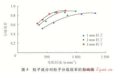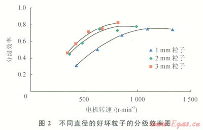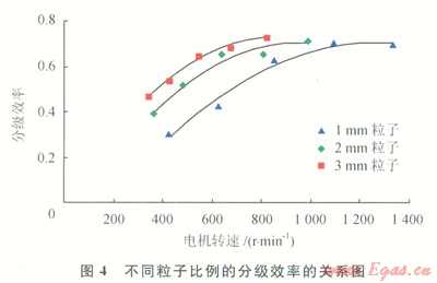 實(shí)驗(yàn)材料仍為直徑分別為1mm、2mm、3mm的好壞粒子的混合物,但好壞粒子混合比例變?yōu)?span lang="EN-US">1:1(體積比),得到分級效率和電機(jī)轉(zhuǎn)速之間的關(guān)系(圖4)。
