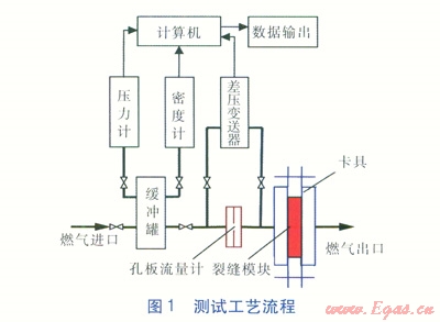 卡具是固定模塊的專門器具,主要作用是將模塊準(zhǔn)確固定于測試管道中,在與模塊接觸面上用橡膠填料密封,并通過卡具旋緊螺栓來緊固及密封模塊??ň呖伸`活裝卸更換模塊,便于對不同模塊的測試。燃?xì)膺M出口管選用DN 400mm螺旋縫鋼管,孔板前直管段長度為1520倍管外直徑,孔板后直管段長度為5倍管外直徑。測試中模塊后鋼管長度為1m,并引至室外,模塊后管道的阻力忽略不計,以模擬真實管道靜置時裂縫燃?xì)庑孤﹫鼍?。測試過程中,有安全保障措施方案,室外配備專人監(jiān)控燃?xì)夥派?,確保安全。由于測試排放燃?xì)饬坎淮?,時間不長,對周圍大氣環(huán)境影響較小。測試工藝流程見圖1。