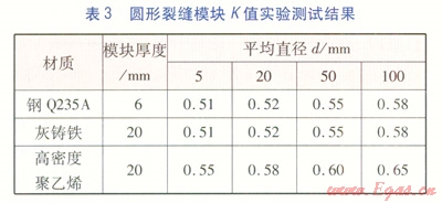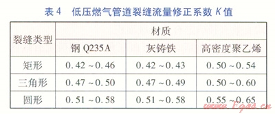 經(jīng)多次實驗驗證,在燃?xì)獾蛪汗鉅顩r下,改變?nèi)細(xì)獾膲毫?span lang="EN-US">(緩沖罐內(nèi)燃?xì)鈮毫?span lang="EN-US">),測試的K值不變,且K值受模塊壁厚影響甚微。由此得出管道裂縫流量修正系數(shù)K的取值范圍,見表4。