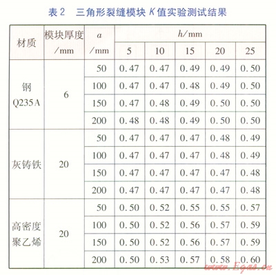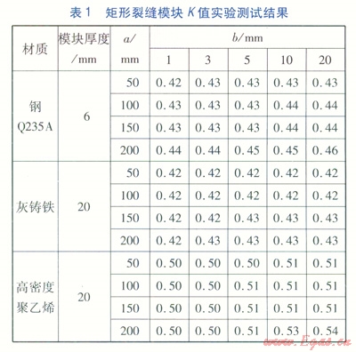 流量修正系數(shù)K的取值,主要取決于裂縫斷面形狀、管材。在實驗室需制作相關(guān)模型分類測試計算。建立不同裂縫形狀及大小、不同板材及厚度的模塊,通過對各種模塊的測試分析計算,得出流量修正系數(shù)K的取值范圍。