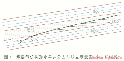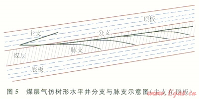 3)在每個(gè)分支上側(cè)鉆若干脈支(一般3~8個(gè)),脈支在煤層內(nèi),以溝通煤層內(nèi)裂隙為主要目的,不出煤層,長度一般50~400m,不求長,但數(shù)量盡可能多,以增大煤層氣解析面積(圖5)。