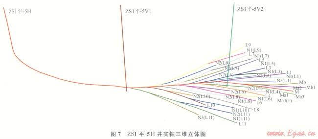 ZSl平-5H井是中國石油華北油田公司在山西沁水盆地的第1口煤層氣仿樹形水平井先導(dǎo)試驗(yàn)。由1口工藝井(ZSl平-5H井)和1口排采直井(ZSl平-5H井)、1口監(jiān)測井(ZSl平-5H井)組成(圖7),工藝井主支設(shè)置在煤層頂板泥巖中,距煤層頂部保持適當(dāng)距離(一般控制在0.5~3m),不觸媒;排采井、監(jiān)測井在煤層頂板造洞穴,洞穴底部距離煤層1m,直徑0.6m,高度6m。