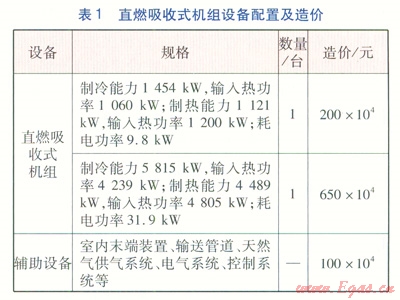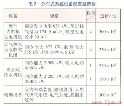 擬采用直燃型吸收機(jī)組、分布式系統(tǒng)分別為商業(yè)建筑供能??紤]到供冷期冷負(fù)荷較高,因此按50%的設(shè)計(jì)冷負(fù)荷(6500kW)作為設(shè)備選型依據(jù)。直燃吸收式機(jī)組、分布式系統(tǒng)設(shè)備配置及造價(jià)分別見(jiàn)表l、2。由表1可知,對(duì)于直燃吸收式機(jī)組,供冷期運(yùn)行2臺(tái)直燃吸收式機(jī)組(總供冷能力為7269kW),供暖期運(yùn)行供熱能力為1454kW的直燃吸收式機(jī)組,其余冷熱負(fù)荷由輔助電驅(qū)動(dòng)熱泵空調(diào)設(shè)備承擔(dān)。由表2可知,對(duì)于分布式系統(tǒng),供冷期運(yùn)行2臺(tái)煙氣熱水型吸收式機(jī)組及2臺(tái)離心式冷水機(jī)組(總供冷能力為7018kW),供暖期運(yùn)行2臺(tái)煙氣熱水型吸收式機(jī)組(總供熱能力為1150kW),其余冷熱負(fù)荷由輔助電驅(qū)動(dòng)熱泵空調(diào)設(shè)備承擔(dān)。