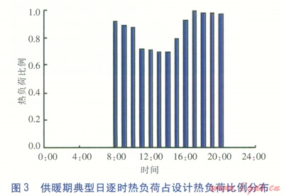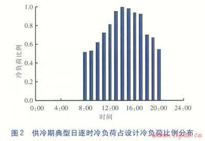 佛山地區(qū)某商業(yè)建筑總建筑面積約13×104m2,供冷期為4月至ll月,單位建筑面積冷負(fù)荷為100Wm2,供暖期為12月至次年1月,單位建筑面積熱負(fù)荷為15Wm2,工作時(shí)間為8002000。供冷期典型日逐時(shí)冷負(fù)荷占設(shè)計(jì)冷負(fù)荷比例分布見(jiàn)圖2,供暖期典型日逐時(shí)熱負(fù)荷占設(shè)計(jì)熱負(fù)荷比例分布見(jiàn)圖3。