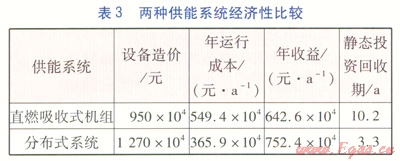 將兩種供能系統(tǒng)部分負(fù)荷運(yùn)行時(shí)間折算成滿負(fù)荷運(yùn)行時(shí)間,設(shè)定供冷期內(nèi)供能系統(tǒng)滿負(fù)荷運(yùn)行時(shí)間為200d,供暖期供能系統(tǒng)滿負(fù)荷運(yùn)行時(shí)間為30d。天然氣價(jià)格按3.79元/m3計(jì)算,電價(jià)按1.00元/(kW·h)計(jì)算,冷熱價(jià)均按100元/GJ計(jì)算。將年耗氣量、耗電量作為年運(yùn)行成本,將年供冷量、供熱量、富裕發(fā)電量作為年收益。兩種供能系統(tǒng)的經(jīng)濟(jì)性比較見(jiàn)表3。由表3可知,在設(shè)定能源價(jià)格下,與直燃吸收式機(jī)組相比,分布式系統(tǒng)的年運(yùn)行成本低,年收益高,靜態(tài)投資回收期僅為3.3a