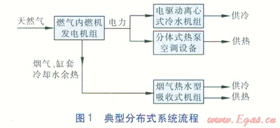 對(duì)于典型分布式系統(tǒng)(系統(tǒng)流程見(jiàn)圖1),燃?xì)鈨?nèi)燃機(jī)發(fā)電機(jī)組將天然氣燃燒產(chǎn)生的35%熱能轉(zhuǎn)化為電能,40%的熱能(以煙氣余熱、缸套冷卻水余熱體現(xiàn))利用煙氣熱水型溴化鋰吸收式冷熱水機(jī)組(以下簡(jiǎn)稱煙氣熱水型吸收式機(jī)組)進(jìn)行供冷、供熱,剩余25%熱能隨煙氣排空。當(dāng)煙氣熱水型吸收式機(jī)組無(wú)法滿足冷熱負(fù)荷時(shí),采用電驅(qū)動(dòng)離心式水冷機(jī)組供冷,分體式熱泵空調(diào)設(shè)備供暖。設(shè)定電能全部用于電驅(qū)動(dòng)空調(diào)設(shè)備制冷及制熱,離心式冷水機(jī)組的制冷系數(shù)取4.5,分體式熱泵空調(diào)的制熱系數(shù)取3.5,則可分別獲得158%的冷能及123%的熱能。設(shè)定煙氣熱水型吸收式機(jī)組的制冷系數(shù)為1.3、制熱系數(shù)為0.95,利用40%的天然氣燃燒熱能,可獲得52%的冷能及38%的熱能。