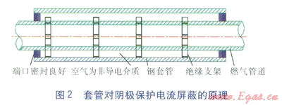 穿越公路、鐵路的燃?xì)夤艿腊凑赵O(shè)計(jì)要求,施工時(shí)要加設(shè)套管,并且套管與主管之間要用絕緣的支架支撐,套管兩端用柔性的防水材料封堵,防止地下水進(jìn)入套管內(nèi)使主管道發(fā)生腐蝕。在對(duì)管道防腐情況的檢測(cè)中我們發(fā)現(xiàn),嚴(yán)格按照規(guī)范要求施工的管道,并不能阻止管道腐蝕的發(fā)生,并且越是加設(shè)套管的地方,主管道發(fā)生腐蝕的情況越嚴(yán)重。為了查明原因,根據(jù)檢測(cè)情況,我們有針對(duì)性地挖出幾處腐蝕嚴(yán)重的地方,通過(guò)查閱相關(guān)資料,并聘請(qǐng)專(zhuān)家現(xiàn)場(chǎng)實(shí)地踏勘、分析,終于弄清了問(wèn)題的癥結(jié)。套管內(nèi)主管道能夠得到有效陰極保護(hù)的必要條件是主管道與套管之間存在導(dǎo)電介質(zhì),而我們嚴(yán)格按照規(guī)范施工的管道,套管與主管道之間設(shè)絕緣支架,套管兩端防水密封良好,套管與主管道之間的介質(zhì)是空氣,然而正是由于兩端密封好,地下水不能進(jìn)入,空氣也不能導(dǎo)電,導(dǎo)致沒(méi)有導(dǎo)電介質(zhì)。主管道雖然加設(shè)陰極保護(hù),但陰極保護(hù)電流受空氣層阻斷被完全屏蔽,不能起到任何作用,這就是套管對(duì)陰極保護(hù)電流產(chǎn)生了屏蔽[2]。另外,主管道在穿越套管施工時(shí),人工拖、拽等操作經(jīng)常破壞主管道的防腐層,如果我們沒(méi)有及時(shí)發(fā)現(xiàn)并修補(bǔ)防腐層,管道埋地投用后,主管道雖然加設(shè)了陰極保護(hù)裝置,但因?yàn)樘坠軐?duì)陰極保護(hù)電流的屏蔽,陰極保護(hù)不起作用,這樣套管內(nèi)主管道的破損處會(huì)處于自然氧化、腐蝕的狀態(tài),進(jìn)而腐蝕會(huì)逐步蔓延,這就是越加設(shè)套管的地方,主管道腐蝕越嚴(yán)重的原因。套管對(duì)陰極保護(hù)電流屏蔽的原理見(jiàn)圖2。