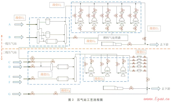 某壓氣站包括一線工程和二線工程。其中,一線有2路來氣,設(shè)計(jì)輸量為120×108m3/a(在0℃,l個(gè)標(biāo)準(zhǔn)大氣壓下的氣體體積)。二線有5路來氣,設(shè)計(jì)輸量為l20×108m3/a。各路來氣壓力約為4MPa,一線經(jīng)過壓縮機(jī)組加壓后壓力約為6.4MPa,二線經(jīng)加壓后壓力上升為9.6MPa。根據(jù)壓氣站的工藝關(guān)斷閥和ESD閥的設(shè)置情況,將該站場分為8個(gè)工藝段位,分別見壓氣站工藝流程圖2和表l所示。