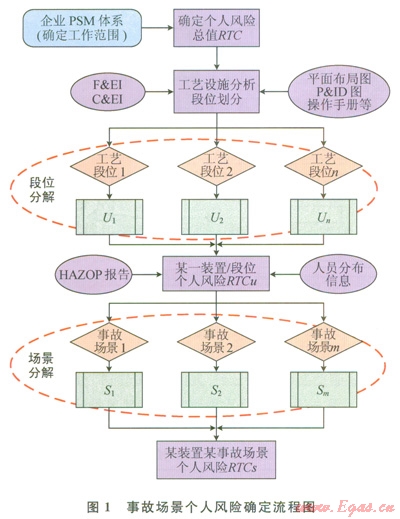 在獲得各工藝段位的個(gè)人風(fēng)險(xiǎn)準(zhǔn)則RTCU之后,進(jìn)入圖1所示的第2階段的場景分解:根據(jù)HAZOP報(bào)告(或其他的工藝災(zāi)害分析PHA結(jié)果),以及設(shè)施的人員分布信息,由下式計(jì)算各事故單元的個(gè)人風(fēng)險(xiǎn)準(zhǔn)則RTCS。即