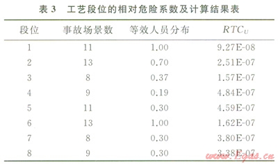 得到各工藝段位的風(fēng)險(xiǎn)準(zhǔn)則額度后,按照?qǐng)D1所示的第二階段計(jì)算流程,就可以得到某一工藝段位的各事故場景RTCS。為此需要統(tǒng)計(jì)該站場內(nèi)的人員分布情況,具體包括站長、自控工程師、設(shè)備工程師、通訊工程師、電氣工程師、運(yùn)行人員、保管和門衛(wèi)等8類人員。這里各類人員都是當(dāng)作假想人員來加權(quán)考慮的,以避免某一類別的人員數(shù)增加而導(dǎo)致風(fēng)險(xiǎn)評(píng)估中的Salami切片現(xiàn)象[3]??尚诺氖鹿蕡鼍皵?shù)根據(jù)該站場的HAZOP分析報(bào)告確定,此外本例中為簡化起見,令參數(shù)UFU=1。根據(jù)式(4)和式(5)計(jì)算得到最終所需要的事故場景定量風(fēng)險(xiǎn)容許準(zhǔn)則值RTCU,如表3所示。