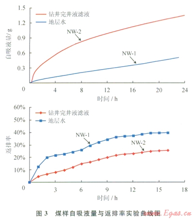 煤巖具有高毛細管壓力特征,鉆井完井液濾液與煤層接觸后在毛細管力的作用下將發(fā)生毛細管自吸,使煤層含水飽和度增加,氣相滲透率降低,并導致后期排采作業(yè)中鉆井完井液濾液長時間難以完全返排。為了掌握煤巖對鉆井完井液濾液的毛細管自吸特征,開展了相同滲透率級別煤樣的地層水和鉆井完井液濾液毛細管自吸實驗和模擬排采過程的氣驅(qū)水返排實驗[14]。實驗結(jié)果(圖3)表明,自吸曲線初始階段白吸速率很快,液相在毛細管力作用下迅速自吸進入裂隙和大孔中,隨著時間的增長白吸速率逐漸下降,液相以擴散吸附的方式進入微孔,相同時間內(nèi)鉆井完井液濾液的白吸量高于地層水的自吸量。通過氣相返排實驗結(jié)果(圖3和表l)可以看出滲透率級別相近條件下地層水的返排率明顯高于鉆井完井液濾液的返排率,表明鉆井完井液濾液的吸附滯留將嚴重影響煤樣的返排能力,導致氣相滲透率的顯著降低。