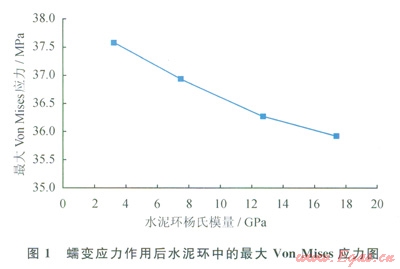 在以往關于蠕變地應力對封固系統(tǒng)受力狀態(tài)影響的研究中,建立的封固系統(tǒng)模型通常包括套管、水泥環(huán)和地層3個部分,將蠕變地應力施加于地層外側[19-20]。工程實際中,蠕變地應力最終直接作用于水泥環(huán)上[15],與上述建立的模型有所差別。本研究根據工程實際情況,建立的封固系統(tǒng)模型只包括套管和水泥環(huán)兩部分,將蠕變地應力直接施加于水泥環(huán)外側。井眼直徑取為215.9mm,套管內外徑分別取為l57.1mm和177.8mm,套管楊氏模量及泊松比分別取為210GPa和0.26,水泥環(huán)泊松比取為0.19,變化水泥環(huán)楊氏模量分別為3.32GPa(水泥漿密囊1.57g/cm3,無圍壓,抗壓強度16.4MPa)、7.49GPa(水泥漿密度1.79g/cm3,無圍壓,抗壓強度21.2MPa)、l2.73GPa(水泥漿密度1.85g/cm3,圍壓5MPa,抗壓強度27.1MPa)、17.45GPa(水泥漿密度1.9g/cm3,圍壓20MPa,抗壓強度34.3MPa)。一界面和二界面處的初始擠壓應力分別設為2MPa和3MPa,蠕變地應力取為40MPa。利用ANSYS軟件建模和計算封同系統(tǒng)中的應力,選擇Von Mises準則汁算得到水泥環(huán)中的最大應力(位于水泥環(huán)內側)(圖1)。