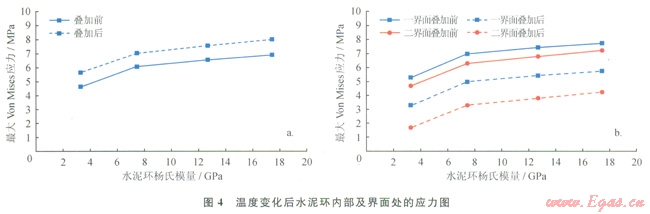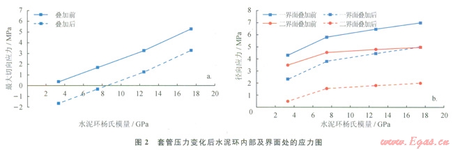 由圖4-a圖看出,水泥環(huán)內的最大Von Miscs應力隨水泥環(huán)楊氏模量的增大而增大;與初始應力替加后,Von Mises應力增大為4.4~8.0MPa,小于普通水泥環(huán)的屈服強度。所以,當溫度變化幅度不大時,水泥環(huán)通常不會發(fā)生屈服破壞,但溫度升高幅度較大時水泥環(huán)可能會發(fā)生屈服破壞。因此,對熱采井等應避免使用膨脹水泥漿,且應使用低楊氏模量的水泥環(huán)。由圖4-b可以看出,與初始應力疊加前,一、二界面在徑向上受拉伸應力的作用且應力隨水泥環(huán)的楊氏模量增大而增大,為4.4~8.0MPa,遠大于一、二界面膠結的抗拉強度,會破壞一、二界面膠結;與初始應力疊加后,徑向應力顯著降低至1.4~6.0MPa,降低了一、二界面膠結破壞的風險。因此,通過降低水泥環(huán)楊氏模量和增大初始應力都可以降低界面膠結破壞的風險,建議采用較低楊氏模量的水泥環(huán)或使用膨脹水泥來預防失效。