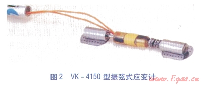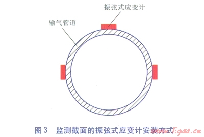 目前國內(nèi)外比較先進的管道應(yīng)變傳感器主要包括振弦式應(yīng)變計、FBG光纖光柵應(yīng)變計、GFRP分布式應(yīng)變傳感光纜。VK-4150型振弦式應(yīng)變計見圖2。監(jiān)測截面的振弦式應(yīng)變計安裝方式見圖3。監(jiān)測截面指輸氣管道上安裝了振弦式應(yīng)變計的一個受測截面,每個監(jiān)測截面安裝3支振弦式應(yīng)變計,呈品字形安裝的3支振弦式應(yīng)變計足以計算出管道在該截面圓周上任意一點的應(yīng)變量。沿管道軸向間隔20m左右設(shè)1個監(jiān)測截面,一個監(jiān)測截面的造價約1.5×104元。
