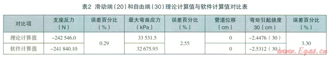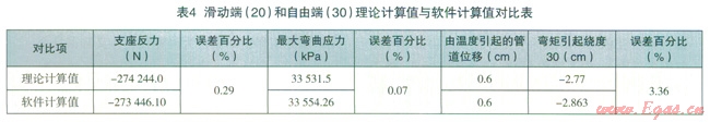 通過對兩種應(yīng)力計(jì)算結(jié)果的比較和誤差分析,很容易從上面列表中看出:理論計(jì)算值與軟件計(jì)算值中誤差最大者,即由管線自重引起的支座反力偶和最大彎曲應(yīng)力。這是由于軟件在計(jì)算過程中采用迭代法,而在理論計(jì)算中忽略了各投影面力矩之間互相關(guān)系的二次項(xiàng),從而造成兩者之間的誤差。因管線自重對整個(gè)管線應(yīng)力情況的影響最小,我們在進(jìn)行管線應(yīng)力分析時(shí)主要考慮的管線影響因素就是溫度和內(nèi)壓。