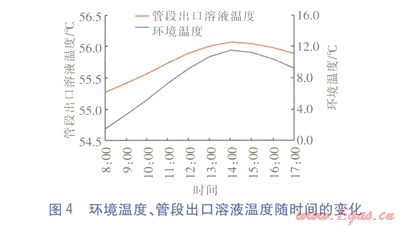 其他條件不變,采用長沙典型年1月1日8:00—17:00的逐時(shí)室外干球溫度作為環(huán)境溫度,對管段0-4出口溶液溫度進(jìn)行仿真計(jì)算。環(huán)境溫度、管段出Vl溶液溫度隨時(shí)間的變化見圖4。由圖4可知,計(jì)算工況下,環(huán)境溫度從最低(1.5℃)升至最高(11.5℃),管段0-4出口溶液溫度由55.27℃升至56.07℃。