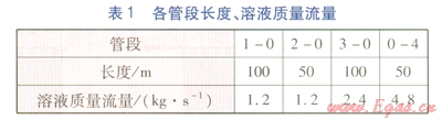 各管段長度、溶液質(zhì)量流量見表1。設(shè)定節(jié)點(diǎn)1~3處溶液溫度均為60℃,管段1-0、2-0、3-0溶液質(zhì)量分?jǐn)?shù)分別為41%、38%、41%,環(huán)境溫度為5℃,各管段單位長度散熱系數(shù)均取2W/(m·K)。