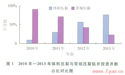 2010年—2013年蜀南氣礦在川南地區(qū)加砂壓裂鉆井累計投資267623萬元:其中體積壓裂179231萬元、占比66.97%,常規(guī)壓裂88392萬元、占比33.03%。在此期間,2010年加砂壓裂投資21311萬元:其中體積壓裂5386萬元,占比25.25%,常規(guī)壓裂15925萬元,占比74.75%;2011年加砂壓裂投資59344萬元:其中體積壓裂28608萬元,占比48.21%,常規(guī)壓裂30736萬元,占比51.79%;2012年投資107910萬元:其中體積壓裂80645萬元,占比74.73%,常規(guī)壓裂27265萬元,占比25.27%;2013年投資79058萬元:其中體積壓裂64592,占比81.7%,常規(guī)壓裂14466萬元,占比18.3%,體積壓裂投資占比呈逐漸上升趨勢(圖2)。