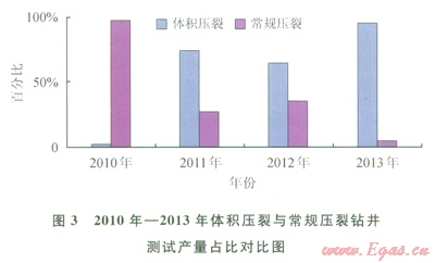 2010年—2013年蜀南氣礦在川南地區(qū)加砂壓裂鉆井累計測試產量732.49×104m3/d:其中體積壓裂獲取測試產量497.63×104m3/d,占比67.94%,常規(guī)壓裂獲取測試產量234.86×104m3/d,占比32.06%。在此期間,2010年測試產量39.82×104m3/d:其中體積壓裂1.08×104m3/d,占比2.79%,常規(guī)壓裂38.74×104m3/d,占比97.21%;2011年測試產量48.24×104m3/d:其中體積壓裂35.41×104m3/d,占比73.4%,常規(guī)壓裂12.83×104m3/d,占比26.6%;2012年測試產量498.89×104m3/d:其中體積壓裂322.52×104m3/d,占比64.65%,常規(guī)壓裂176.37×104m3/d,占比35.35%;2013年測試產量145.54×104m3/d:其中體積壓裂138.62×104m3/d,占比95.25%,常規(guī)壓裂6.92×104m3/d,占比4.75%,體積壓裂測試產量占比呈上升趨勢(圖3)。