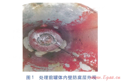 對(duì)于腐蝕穿孔情況,經(jīng)過實(shí)踐研究,我們總結(jié)了較為理想的處理方法,獲得了良好的效果。具體步驟為:對(duì)出現(xiàn)腐蝕穿孔的罐體拆卸后進(jìn)行打磨,除去罐體內(nèi)壁銹斑及破損的防腐層。然后對(duì)穿孔部位進(jìn)行同材質(zhì)補(bǔ)焊,并將焊渣打磨干凈,將適量的LG-001、LG-002防腐劑按比例混合后進(jìn)行防腐層涂敷處理,最后進(jìn)行烘干,如此重復(fù)兩次即可達(dá)到良好的防腐效果。該防腐技術(shù)為無毒、食品級(jí)防腐新技術(shù),成品表面強(qiáng)度高、彈性好,且表面光滑,抗機(jī)械損傷能力強(qiáng)。處理前后罐體內(nèi)壁防腐層外觀分別見圖1、2。