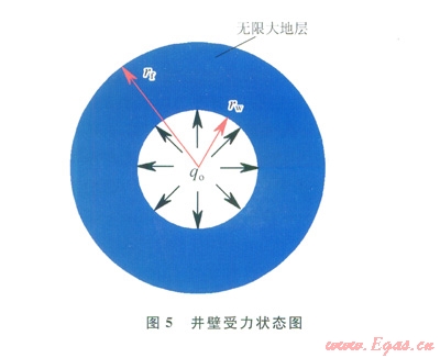 地層  井眼模型如圖5。地層可看作是半徑無窮大的圓,由圣維南原理[22]可知:無窮大地層半徑遠(yuǎn)大于井眼半徑,因此由井壁應(yīng)力對無窮遠(yuǎn)處的總應(yīng)力擾動(dòng)是很小的,可以不計(jì)。由于水泥漿未凝固,故井壁僅受水泥漿液柱壓力(qo)的內(nèi)壓作用。