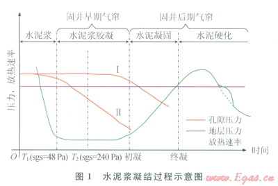 隨著水化反應(yīng)的進(jìn)行,液態(tài)水泥漿逐漸凝固成固態(tài)水泥石需經(jīng)歷液相、膠凝、凝固和硬化等4個(gè)階段[15](1)。液態(tài)水泥漿能夠完全傳遞孔隙壓力,不會發(fā)生氣竄;膠凝態(tài)水泥漿不斷形成膠凝結(jié)構(gòu),發(fā)生塑性體積收縮,引起隙壓力逐漸降低;初凝后,水泥漿進(jìn)入凝固、硬化階段,表現(xiàn)出固態(tài)特征,滲透率極低,能有效阻止水泥環(huán)本體氣竄[16-17]。南上述研究分析可知,固井早期氣竄包括兩個(gè)階段:靜膠凝強(qiáng)度過渡時(shí)間(T1T2);靜膠凝強(qiáng)度過渡時(shí)間結(jié)束時(shí)刻至初凝(T2至初凝)。