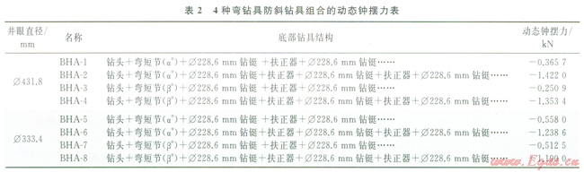 塔里木山前高陡構(gòu)造井斜控制[7]是空氣鉆井難題之一,空氣錘防斜技術(shù)[8]難以奏效,基于鉆具動力學(xué)特性分析,提出一種“彎鉆具動力學(xué)防斜技術(shù)”[9-10],對4種不同鉆具組合的動態(tài)鐘擺力進(jìn)行了分析,優(yōu)選出Æ431.8mmÆ333.4mm井眼的彎短節(jié)+雙扶正器”的動力學(xué)防斜鉆具組合(2),其底部鉆具組成為:鉆頭+彎短節(jié)(a°)+Æ228.6mm鉆鋌+扶正器+Æ228.6mm鉆鋌+扶正器+Æ228.6mm鉆鋌……