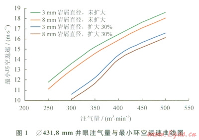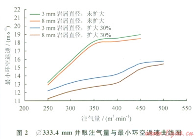 采用最小動能法判斷標(biāo)準(zhǔn):l]確定合理灃氣量,該方法認(rèn)為:當(dāng)環(huán)空空氣最小返速不小于15.24ms時(shí),能將井底產(chǎn)生的巖屑攜帶至地面。根據(jù)實(shí)際鉆屑情況,模擬計(jì)算了Æ431.8mmÆ333.4mm兩種井眼尺寸,考慮不同井眼擴(kuò)大率,不同巖屑顆粒尺寸條件下的最小環(huán)空返速,參照最小動能法判斷標(biāo)準(zhǔn),確定出合理注氣量(1,圖1、2)。