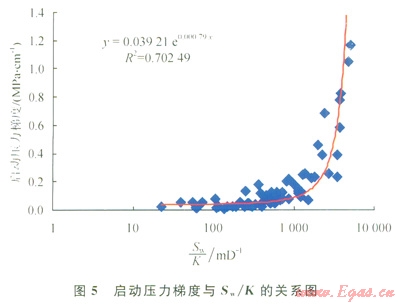 巖石孔隙介質(zhì)中,由于氣水潤濕性的差異和毛細管壓力的作用,水優(yōu)先占據(jù)小孔喉和孔隙壁面,并且由于氣體的易壓縮性,其在含水的孔隙中流動時,首先選擇大的孔隙,隨著流動壓差的增大,逐漸驅(qū)動小一些吼道的水或使孔隙壁面的水膜變薄,在未形成連續(xù)氣流的孔喉處氣體前沿呈跳躍式前行,且容易被水卡斷[17],這就是氣體在含水孔隙介質(zhì)中流動存在啟動壓力梯度的微觀機理。表現(xiàn)在滲流曲線上,流量與壓差并不呈線性關(guān)系,通過數(shù)據(jù)擬合可以求出不同含水飽和度時的啟動壓力,除以巖樣長度即為啟動壓力梯度,將全部巖樣的實驗數(shù)據(jù)繪于同一圖上(圖4),發(fā)現(xiàn)啟動壓力梯度隨含水飽和度增大而增大,且?guī)r樣滲透率越小,這種趨勢越明顯,當含水飽和度大于50%以后,啟動壓力梯度明顯增大。進一步通過數(shù)據(jù)分析發(fā)現(xiàn),啟動壓力梯度與含水飽和度和滲透率的比值(Sw/K)具有很好的相關(guān)性(圖5),呈以下的指數(shù)函數(shù)關(guān)系: