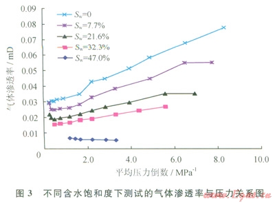 前人研究表明[14-16],致密砂巖中由于復雜的孔隙結(jié)構(gòu),氣體滲流存在非達西特征。筆者通過氣驅(qū)水實驗分析表明,當驅(qū)替壓差較小時,氣體不能驅(qū)動水形成流動,只有當驅(qū)替壓差大于某一臨界值,足以克服水鎖產(chǎn)生的毛細管阻力才能發(fā)生流動,這在滲流曲線上表現(xiàn)為啟動壓差。對同一巖樣,其含水飽和度越高,氣體始流動所需的驅(qū)動壓差越大,氣體開始流動后,驅(qū)替壓差越大流量越大;巖樣含水飽和度越低,相同驅(qū)替壓差下流量越大。但是,壓差增大滲透率不一定變大,當巖樣含水飽和度較高時,隨著驅(qū)替壓差的增大(平均壓力倒數(shù)減小),氣體滲透率有的增加,有的減??;當巖樣含水飽和度較低時,隨著驅(qū)替壓差的增大(平均壓力倒數(shù)減小),氣體滲透率普遍呈先降低后增加的特點,這是因為前期主要受滑脫效應的影響,而后期,當平均壓力倒數(shù)低于一定程度后(即驅(qū)替壓差大于一定值后),這時氣體帶動部分孔隙中的水流動,或使孔隙壁的水膜變薄,氣體滲流通道增加。因此氣體滲透率開始增加(圖3)。含水飽和度越高,這種水的可動性對氣體滲流的影響越明顯。