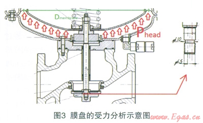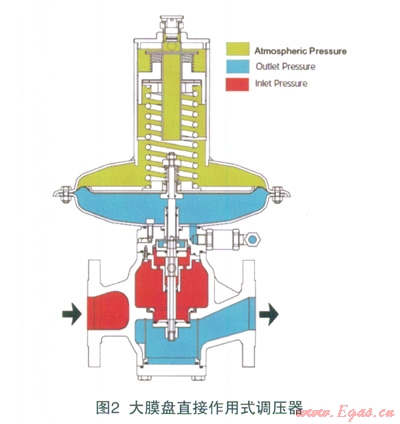 該款調(diào)壓器為某進口品牌,在我公司大量使用,其質(zhì)量和性能較為穩(wěn)定,一直沒有出現(xiàn)過問題。該款調(diào)壓器為大膜盤直接作用式調(diào)壓器,其連接口徑DN80,膜盤頭部直徑為書600,其結(jié)構(gòu)型式平衡閥芯式調(diào)壓器,閥瓣位于閥座下部,是典型的失效開啟型調(diào)壓器,在主皮膜破裂或壓力信號管無壓力反饋時,閥口處于開啟狀態(tài)。大膜盤調(diào)壓器的特點是結(jié)構(gòu)簡單、響應(yīng)迅速、關(guān)閉精度高,由于大膜盤的作用,其關(guān)閉精度很高,當下游壓力高于設(shè)定值時,閥口關(guān)閉密封性好,無流量泄漏。其結(jié)構(gòu)見圖2。