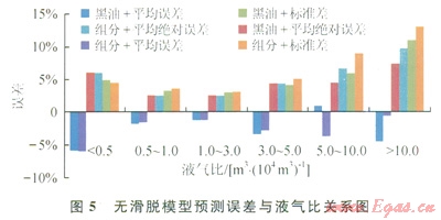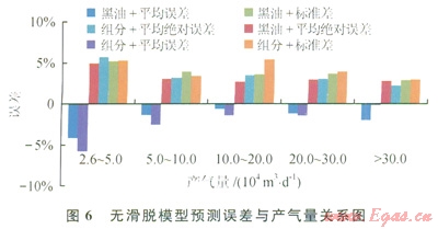 無滑脫模型各項誤差次之(圖4),組分模型計算誤差大于黑油模型,是由于Govier-Fogarasi用的凝析氣井液氣比為0.05~14.4m3/104m3,從黑油模型對所選模型(無滑脫、Gray和Hagedorn&Brown沒有劃分流型)計算流型看:Mukherjee&Brill和Orkiszewski所有井井簡全部為段塞流,Hasan&Kabir預(yù)測結(jié)果除5井次出現(xiàn)分散泡狀流以外,其余井全為環(huán)狀流。段塞流為一段氣一段液,而環(huán)狀流主要靠氣相中攜帶的液滴和氣相與管壁液膜的摩擦帶液。因此兩種流型的滑脫損失均較小,可以采用無滑脫模型計算壓降。從分段液氣比看,液氣比小于0.5m3/104m3,誤差較大,這主要是由于氣液比極高,舉升壓降極小,13口壓降梯度平均為1.74MPa/1000m,導(dǎo)致井底流壓(13口井底流壓平均13.4MPa)較小,即使計算的井底流壓誤差較小因井底流壓測壓值較小而誤差較大。隨著液氣比的增加,各項誤差逐漸增加(圖5)。現(xiàn)考慮各項誤差限為5%,采用無滑脫模型的液氣比范圍為0.5~5m3/104m3,并對該氣液比條件下的產(chǎn)氣量進(jìn)行了分段統(tǒng)計如圖6所示,隨著產(chǎn)氣量的增加,各項誤差逐漸下降。因此無滑脫模型按黑油計算適用條件為:液氣比0.5~5m3/104m3,產(chǎn)氣量大于5×104m3/d,井底流壓誤差小于5%。