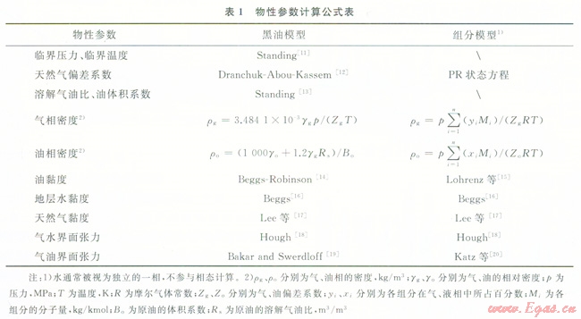 流體物性參數(shù)計算””是凝析氣井井筒壓降計算的基礎(chǔ)。目前主要包括:①黑油模型。通過優(yōu)選經(jīng)驗公式計算溶解氣油比、天然氣偏差系數(shù)、天然氣體積系數(shù)等參數(shù)。②組分模型。通過狀態(tài)方程計算流體密度、黏度、界面張力等。筆者所采用的主要計算模型如表1所示。