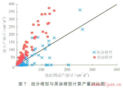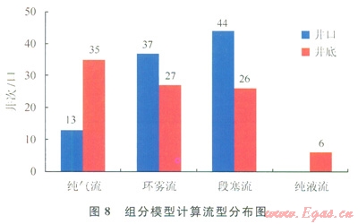 從所選的4個氣液兩相流模型(Hagedorn&Brown、Orkiszewski、Mukherjee&Brill、Hasan&Kabir)看,Hagedorn&Brown模型各項誤差最小,按組分模型計算的誤差明顯小于黑油模型。為了討論組分模型對流型、凝析油流量的影響,現(xiàn)選用誤差較小且考慮流型的Mukherjee&Brill進(jìn)行統(tǒng)計分析。分別按組分模型和黑油模型計算的井筒最大產(chǎn)油量如圖7所示,組分模型計算的井筒最大產(chǎn)油量明顯較地面測試產(chǎn)油量大得多,而按黑油模型計算的產(chǎn)油量明顯偏小,說明隨井筒向上流動過程中,壓力溫度降低導(dǎo)致了凝析油的析出,與實際情況一致;井筒流量的改變使流型發(fā)生明顯變化,黑油模型計算的井筒流型全部為段塞流,組分模型計算時井底高溫高壓凝析油未析出或析出較少,以純氣流、環(huán)霧流和段塞流為主,所占井次比例依次下降,而井口主要流型未變,但各流型的井次比例呈明顯的反比關(guān)系(圖8),使按組分模型計算的各項誤差明顯小于黑油模型。