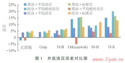 采用工程常用的無滑脫模型、Hagcdorn&Brown[21]、Orkiszewski[22]、Gray[23]、Mukherjee&Brill[24]、Hasan&Kabir[25]對上述凝析氣井井底流壓進(jìn)行了計算,其誤差統(tǒng)計結(jié)果如表3和圖1、2所示。
