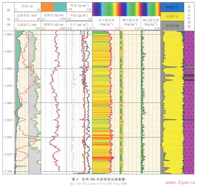 巖心資料、元素俘獲測(cè)井和常規(guī)曲線的結(jié)合給出了東坪氣田基巖儲(chǔ)層的巖性識(shí)別與劃分結(jié)果,表明北部的3區(qū)以花崗巖為主,夾有薄層的中基性侵入巖脈,侵入巖脈的厚度多在13m之間(4),與計(jì)算的隙度等參數(shù)對(duì)比,認(rèn)為侵入巖脈可作為儲(chǔ)層,且由于侵入主要是沿?cái)鄬拥冗M(jìn)行的,侵入過程誘導(dǎo)裂縫產(chǎn)生。因此巖脈的侵入對(duì)于儲(chǔ)層是一個(gè)積極的因素。南部的l區(qū)基巖以變質(zhì)巖為主,圖4是北部東坪306井的巖性劃分結(jié)果。位于區(qū)塊東北角的該井為鈣質(zhì)片麻巖,區(qū)塊內(nèi)已鉆的其他井多為花崗片麻巖和斜長(zhǎng)片麻巖,結(jié)合孔隙度、裂縫等參數(shù)分析認(rèn)為巖性對(duì)物性的控制作用不明顯,這3種不同類型的變質(zhì)巖都可以發(fā)育好的儲(chǔ)層。