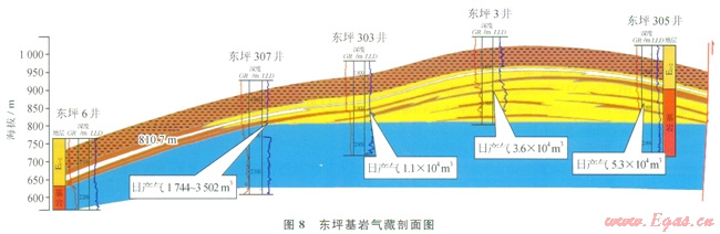 在流體識(shí)別、儲(chǔ)層參數(shù)計(jì)算、有效厚度確定的基礎(chǔ)上,通過多井對(duì)比,對(duì)氣藏有如下認(rèn)識(shí):基巖氣藏為雙重孔隙結(jié)構(gòu),氣藏內(nèi)部受裂縫發(fā)育,后期巖脈侵入等影響,縱向及平面上均表現(xiàn)出一定的非均質(zhì)性,北部的3井區(qū)和南部的l井區(qū)基巖段均為底水塊狀氣藏,基巖氣藏上部和側(cè)向與斷層下盤對(duì)接的地層為E1+2致密泥巖層及膏巖層,對(duì)厚層基巖氣藏起到了很好的封堵作用(8)。