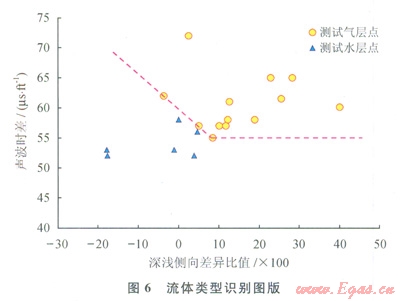 采用深、淺側(cè)向的差異同深電阻率的比值與聲波的交會(huì)圖來確定流體性質(zhì)(6)。從圖6中看出氣層點(diǎn)都位于右上方,而水層點(diǎn)位于左下方,從測(cè)井的原理看含氣好的層段深淺側(cè)向有較大的正差異特征或者小的負(fù)差異,而水層由于淡水鉆井液的侵入會(huì)使得電阻率出現(xiàn)負(fù)差異,當(dāng)然裂縫的發(fā)育情況及產(chǎn)狀對(duì)電阻率的影響比較大,但從解釋結(jié)果看都是以網(wǎng)狀裂縫為主。因此認(rèn)為電阻率的差異與流體類型存在一定的聯(lián)系。