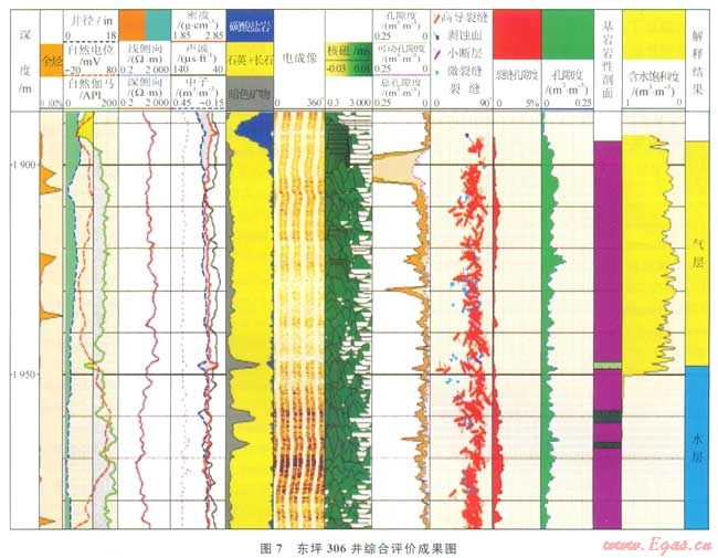 氣層與干層的確定是以隙度大大小進(jìn)行劃分的。核磁資料表明當(dāng)孔隙度為2%時(shí),可動(dòng)流體只有1%,同時(shí)參考了國內(nèi)外眾多的古潛山油氣藏,以隙度2%作為有效儲(chǔ)層的下限。據(jù)前述方法對(duì)區(qū)塊內(nèi)的井進(jìn)行了綜合評(píng)價(jià),如圖7所示為東坪306井的評(píng)價(jià)成果圖。該井1894.5m以下為花崗巖,電成像表明高導(dǎo)裂縫非常發(fā)育,裂縫孔隙度分布在0.05%~0.5%之間,總孔隙度為6.2%,計(jì)算的含氣飽和度為70%,深、淺側(cè)向有小的正差異氣測(cè)錄井顯示較好(中部因取心氣測(cè)低),解釋為氣層;下部巖性、物性與上部相當(dāng),但電阻率明顯降低,且深、淺側(cè)向基本重合,氣測(cè)無示,解釋為水層,據(jù)此確定了氣水界面。其數(shù)據(jù)為:1894.51950.0m,電阻率20100W·m,核磁動(dòng)孔隙度3.2%,溶蝕孔隙度6.2%,裂縫走向NWSE,裂縫孔隙度0.02%~0.50%,含氣飽和度70%,釋為氣層;井段1950.02097.3m,電阻率480W·m,核磁可動(dòng)孔隙度1.5%,溶蝕孔隙度4.0%,縫走向NWSE,裂縫孔隙度0.05%~0.80%,含氣飽和度為0,解釋為水層。
