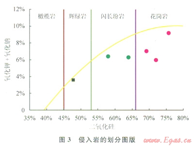 儲(chǔ)層巖性識(shí)別是油氣藏評(píng)價(jià)的前提和基礎(chǔ)工作,與常見的沉積巖不同的是基巖巖性復(fù)雜多變,測(cè)井識(shí)別困難。地面露頭踏勘和鉆井巖心分析表明東坪氣田的基巖包括火成巖和變質(zhì)巖兩大類巖性(1),北部3井區(qū)基巖以侵入巖為主,南部1井區(qū)以變質(zhì)巖為主。研究表明侵入巖主要為花崗巖,中夾有輝綠巖、閃長(zhǎng)玢巖的巖脈。變質(zhì)巖可分為3大類,分別為花崗片麻巖、斜長(zhǎng)片麻巖和鈣質(zhì)片麻巖。侵入巖和變質(zhì)巖的區(qū)分可利用鉀和自然伽馬的交會(huì)圖(2)。由于侵入巖以鉀長(zhǎng)石含量較高的花崗巖為主,其鉀含量和自然伽馬為相對(duì)高值,變質(zhì)巖的鉀和自然伽馬相對(duì)低值。因此侵入巖位于交會(huì)圖的右上角而變質(zhì)巖位于交會(huì)圖的左下方。利用元素俘獲譜資料實(shí)現(xiàn)兩大類巖性的細(xì)分。二氧化硅與氧化鈉和氧化鉀之和的交會(huì)圖(3)實(shí)現(xiàn)侵入巖的細(xì)分,花崗巖的二氧化硅含量高,為66%,輝綠巖為45%~53%,閃長(zhǎng)玢巖為53%~66%。據(jù)此實(shí)現(xiàn)了北部3井區(qū)基巖儲(chǔ)層巖性的識(shí)別與劃分。變質(zhì)巖的種類繁多且其成因復(fù)雜,因而變質(zhì)巖的識(shí)別與劃分相對(duì)侵入巖要復(fù)雜得多。通常認(rèn)為在變質(zhì)巖的形成過程中化學(xué)成分穩(wěn)定,這為利用元素俘獲譜測(cè)井劃分巖性提供了有利條件,同時(shí)由于礦物成分的不同其密度與中子值也有所不同。因此常規(guī)曲線對(duì)巖性的劃分也提供了好的資料。