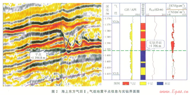研究表明,在一定的地質(zhì)條件下砂體含氣后在地震資料表現(xiàn)為明顯的“亮點”效應(yīng),氣層的振幅異常能較好地反映砂體的含氣情況川。在鶯歌海盆地的多個淺層氣藏實際鉆井資料證實,鉆在振幅“亮點”范圍內(nèi)的井,其目的層均含氣。低部位如受氣水界面控制,同一種地震屬性在氣水邊界之上和之下表現(xiàn)出來的響應(yīng)有很大差異,形成“平點”現(xiàn)象,根據(jù)該平點信息可確定氣水界面。測井解釋結(jié)果也證實該界面是可靠的。如圖2所示,東方氣田的氣組,根據(jù)平點信息確定的氣水界面為海拔-1394.6m,根據(jù)該界面圈定的含氣范圍內(nèi)有明顯的“亮點效應(yīng)”,實際井鉆遇的氣水界面為海拔-1396.0m,證實在該區(qū)域可以依據(jù)三維地震資料的亮點效應(yīng)和平點現(xiàn)象來確定氣水界面,從而確定氣田的含氣面積。該方法可以應(yīng)用在沒有實鉆界面的其他氣組或鄰近相似氣田,來彌補海上氣田鉆井工作量相對少引起資料不足的缺陷。