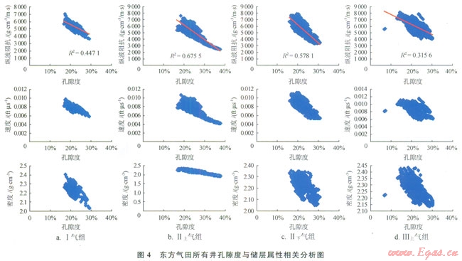 在進行儲層隙度橫向描述之前,需要進行了大量的儲層物性研究工作。研究的目的是通過分析儲層物性和與地震資料有直接關(guān)系的儲層的速度、密度和波阻抗等地震屬性的相關(guān)關(guān)系,來建立起合理的井震關(guān)系[14]。中海石油(中國)有限公司湛江分公司西部東方氣田各氣組單井孔隙度與地震的波阻抗、速度和密度都有一定的相關(guān)性。圖4為東方氣田多井分氣組進行的隙度與地震的波阻抗、速度和密度的相關(guān)分析結(jié)果,從圖4上可以看出各氣組儲層的孔隙度與這幾種地震屬性有較好的相關(guān)關(guān)系,其中Ⅱ氣組孔隙度和波阻抗的相關(guān)關(guān)系高達0.82,這說明東方氣田儲層的孔隙度與地震屬性有較好的相關(guān)性。因此,可以利用與地震屬性的相關(guān)性預測儲層孔隙度的方法來描述孔隙度的橫向變化。通過抽井檢驗和儲量對比等方式檢查認為各個氣組的孔隙度預測結(jié)果均為合理結(jié)果(5)