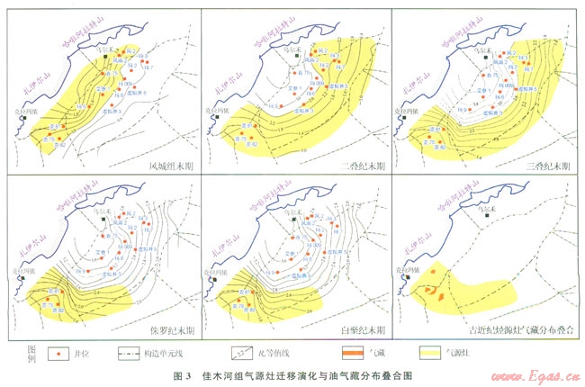 佳木河組氣源灶的演化歷史模擬結(jié)果表明,佳木河組氣源灶在風(fēng)城末期即開始出現(xiàn),但此時(shí)范圍較小,主要分布在瑪湖凹陷的西北斜坡部位;隨著地質(zhì)時(shí)間的推移,氣源灶的范圍不斷擴(kuò)大,位置也由瑪湖凹陷的中心向東南方向遷移。二疊紀(jì)末期,氣源灶范圍達(dá)到最大,之后由于部分地區(qū)烴源巖過成熟不再產(chǎn)氣而氣源灶范圍開始縮小。到現(xiàn)今,氣源灶的范圍主要分布在中拐區(qū)(3)。根據(jù)煤型氣(82)碳同位素值計(jì)算出天然氣R。值(R。2.17),與佳木河組下亞段烴源巖演化史對(duì)比分析發(fā)現(xiàn),天然氣應(yīng)當(dāng)是古近紀(jì)一現(xiàn)今的產(chǎn)物[13]。目前發(fā)現(xiàn)的煤型氣藏也主要分布在西北緣的中拐區(qū)[14-17],說明新近紀(jì)氣源灶控制了煤型氣藏的集中分布[18]。