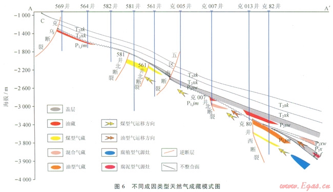在區(qū)域向東傾斜的背景下,佳木河組頂部不整合面之的風(fēng)化黏土層構(gòu)成了有效封閉,其下的半風(fēng)化巖石是二疊系油氣重要的側(cè)向運(yùn)移通道。統(tǒng)計(jì)結(jié)果表明,距離不整合面越近,儲(chǔ)集層物性越好,有油氣顯示的層數(shù)越多。風(fēng)城組生成的油型氣一方面受自身烴源巖的封隔作用,另外一方面由于烴源巖的演化階段未完全進(jìn)入生氣階段,使得油型氣主要分布在風(fēng)城組尖滅線以內(nèi)。而佳木河組氣源巖生成的煤型氣大量沿著這套半風(fēng)化巖石發(fā)生長距離的側(cè)向運(yùn)移(6),大范圍分布在斜坡外緣。煤型氣與油型氣之間則分布了混源氣。輸導(dǎo)斷層相比遮擋型斷層,其發(fā)育規(guī)模更大,歷史上經(jīng)歷了多期活動(dòng),垂向上斷穿至白堊系,平面上主要分布于西北緣斜坡外環(huán)的克拉瑪依一烏夏斷裂、紅山嘴斷裂等,主要對(duì)早期生成并運(yùn)移至此的原油及油型氣起到縱向調(diào)節(jié)作用[21]。