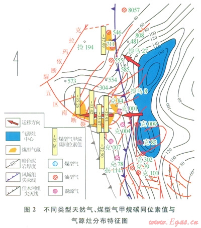 佳木河組干酪根碳同位素值很重,581井、514井和5949個(gè)樣品干酪根的碳同位素值為-21.96‰-20.29‰,有機(jī)質(zhì)類型以腐殖型干酪根為主。這套烴源巖成熟度較高,鏡質(zhì)體反射率為1.38%~1.90%,綜合評(píng)價(jià)為高成熟的較差氣源巖。依據(jù)沉積古地理推測在凹陷中泥巖的有機(jī)碳含量應(yīng)該更高。因此,佳木河組應(yīng)該是一套(且是研究區(qū)內(nèi)唯一一套)具有一定有機(jī)質(zhì)豐度、演化程度較高、具有生氣能力的烴源巖。加之煤型氣與其碳同位素值相近,并且同一來源天然氣的順層運(yùn)移會(huì)造成碳同位素分餾,以煤型氣為主的天然氣甲烷碳同位素值在該區(qū)區(qū)域性斜坡的背景上,呈現(xiàn)出自佳木河組氣源中心向氣藏方向逐漸變輕的趨勢(shì)(2),指示了天然氣白東向西的運(yùn)移方向。油型氣來源已有大量研究[12],皆表明其與原油同源,主要來自于風(fēng)城組烴源巖。