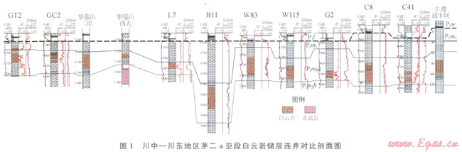 對(duì)川東、川中地區(qū)鉆揭中二疊統(tǒng)鉆井的鉆錄井資料重新梳理,系統(tǒng)研究巖心、巖屑、電測(cè)資料,并對(duì)中二疊統(tǒng)野外露頭剖面(華鎣山二崖剖面、西天剖面、李子埡剖面,豐都暨龍鎮(zhèn)烏羊壩剖面、放牛壩剖面,豐都武平大壩剖面)進(jìn)行仔細(xì)觀(guān)測(cè),筆者發(fā)現(xiàn)[2],川東—中局部地區(qū)中二疊統(tǒng)茅口組茅二a亞段內(nèi)發(fā)育一套最厚為30m的白云巖、硅質(zhì)白云巖儲(chǔ)層(圖1)。