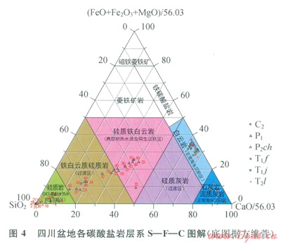 方維萱[7]提出S—F—C圖解。C端元(CaO)代表正常海水的沉積作用形成的碳酸鹽巖,S端元(SiO2)代表以SiO2為酸酐的熱水同生沉積作用形成的硅質(zhì)巖,F端元(FeO+Fe2O3+MgO)代表富Fe、Mg碳酸鹽型熱水同生沉積作用形成的菱鐵礦巖。川東地區(qū)所有中二疊統(tǒng)層狀硅質(zhì)巖、硅質(zhì)白云巖、白云巖樣品均落在硅質(zhì)鐵白云巖(典型的熱水混合同生沉積區(qū))、硅質(zhì)巖(SiO2酸酐型熱水同生沉積區(qū))及鐵白云質(zhì)硅質(zhì)巖(過(guò)渡區(qū))內(nèi),而四川盆地石炭系、長(zhǎng)興組、飛仙關(guān)組、嘉陵江組和雷口坡組的樣品則落在正常海水沉積區(qū)(圖4)。S—F—C圖解顯示中二疊統(tǒng)層狀硅質(zhì)巖、白云巖、硅質(zhì)白云巖成因與其他層系的白云巖成因截然不同,為熱水成因。